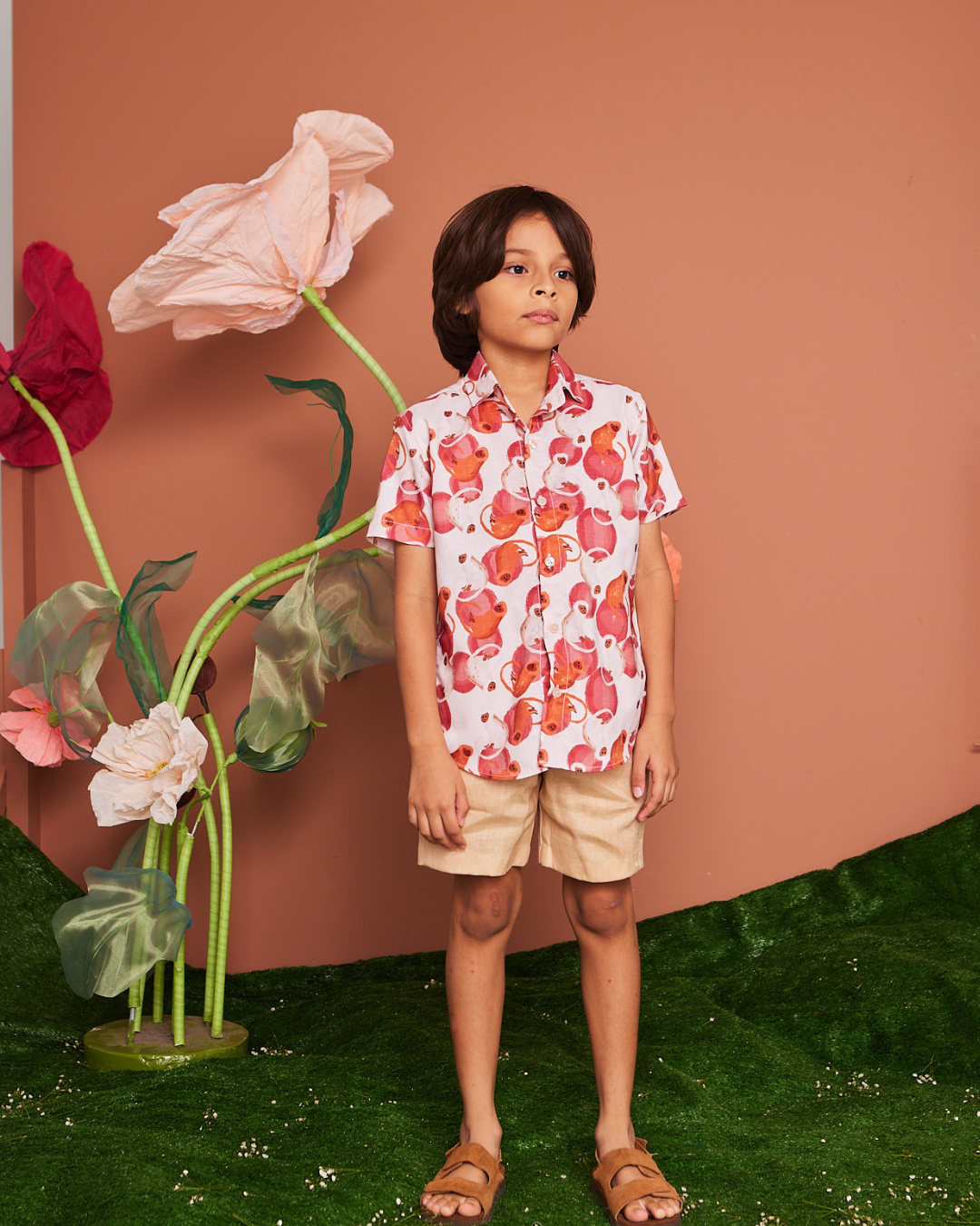 Diseñada para niños exploradores y con estilo, esta camisa combina comodidad, libertad de movimiento y sostenibilidad. Cuenta con cuello camisero, cierre frontal con botones y mangas cortas, ideal para climas cálidos y aventuras al aire libre.
